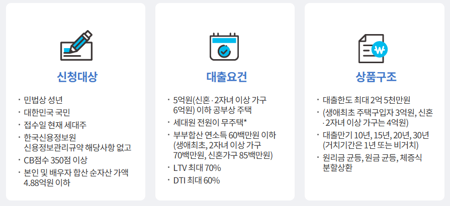 - 자산 요건: 대출신청인 및 배우자의 합산 순자산 가액이 통계청 발표 기준 4.88억 원 이하.