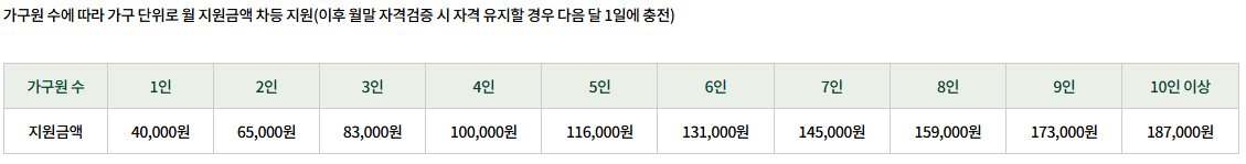 - 생계급여(기준 중위소득 32% 이하) 수급 가구 중 임산부·영유아·아동 포함 가구
