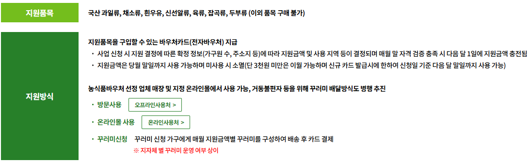 - 온라인 : 농식품 바우처 지정 온라인 사용처에서 이용 가능